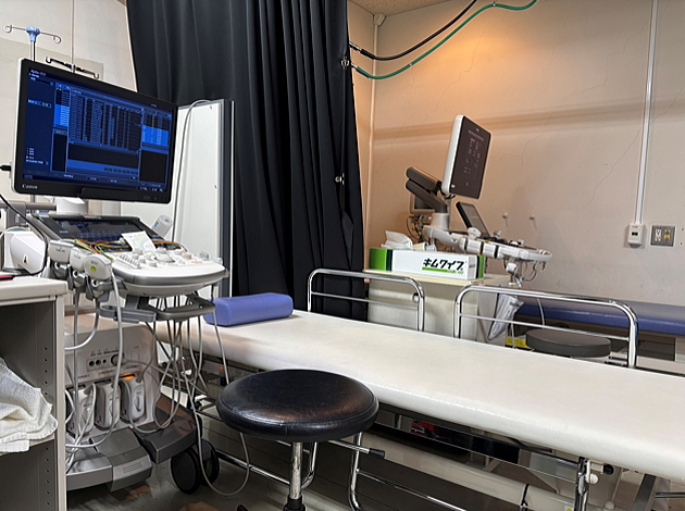 心エコー検査は、非侵襲的に心臓の形態や動きをリアルタイムに観察することができます。すべての心疾患において重要な検査であり、診断、治療効果判定に役立つモダリティとなっています。当院では、年間約9000件の経胸壁心エコー検査を行っており、急性心筋梗塞、心不全、弁膜症、心筋症、感染性心内膜炎、肺血栓塞栓症、先天性心疾患などさまざま疾患の診断や治療効果判定を行っています。また、他科の術前のスクリーニング検査などにおいても重要な役割を果たしています。簡便で、非侵襲的であり、循環器診療において重要な検査です。経食道エコー検査