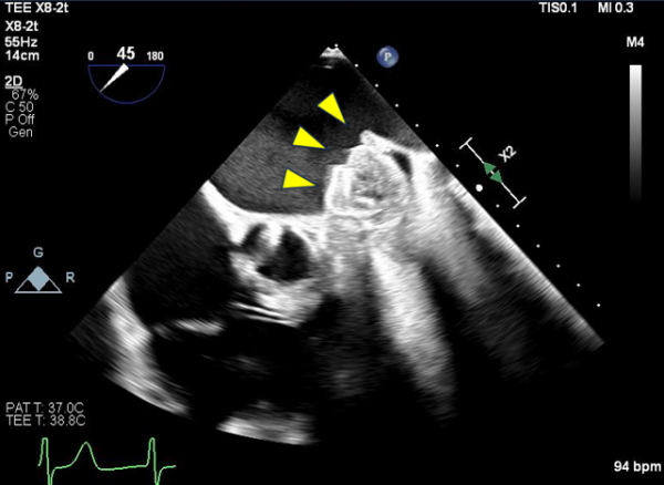 脳梗塞予防のために、抗凝固療法を行わなければならない患者さんにおいて、同時に出血のリスクも高い方に対して、左心耳閉鎖術の適応があります。経カテーテル的に、血栓ができやすい左心耳に栓をする治療となります。本治療において、経食道エコー検査を行い、デバイスの大きさの選択、術中のワイヤーやデバイスの位置の確認、留置後の合併症の有無、デバイスの位置の確認、血液のリークの有無の評価などを行います。上記のように、さまざまなカテーテル治療において、術中の経食道エコー検査は重要な役割を果たしております。今後もカテーテル治療の適応疾患は広がっていくことが考えられ、治療におけるエコー医の役割も重要なものとなっております。